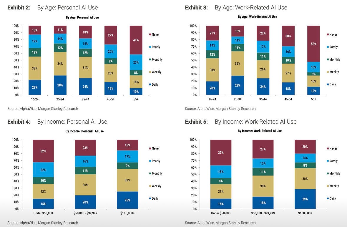 AI adoption splits by age and income. Morgan Stanley data shows 52% of people 55+ have never used AI for work, and 41% have never used it personally. We are still very early. See the full data below.