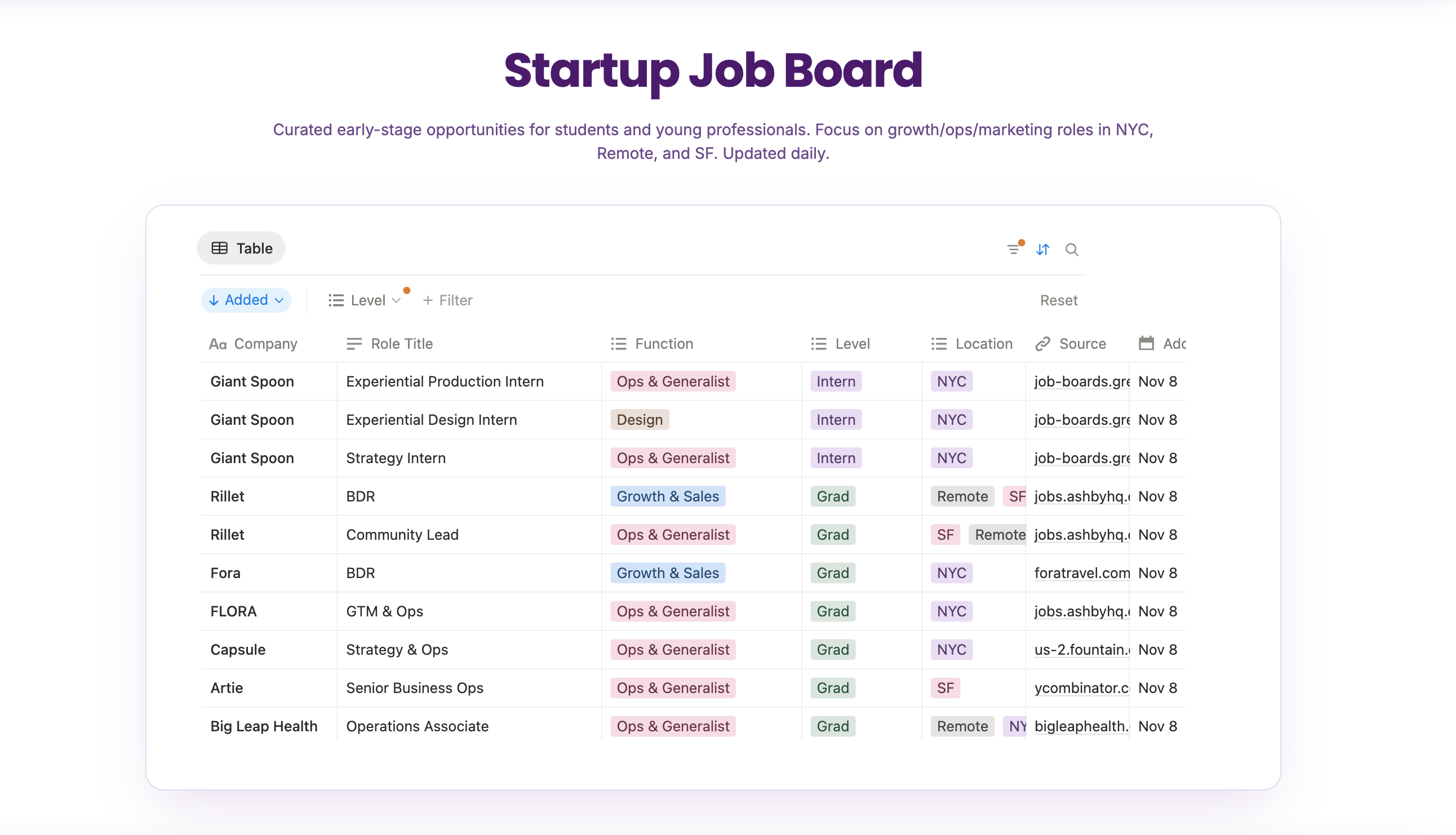 This job board, updated daily, features curated early-stage startup opportunities across growth, ops, marketing, design, and content in NYC, SF, and remote (plan to expand to other geographies in the future!). Feel free to filter by function, level, location, etc. The job board highlights opportunities that have been posted very recently, in addition to hiring posts people make on LinkedIn. Keep up to date by checking it out on our landing page here!