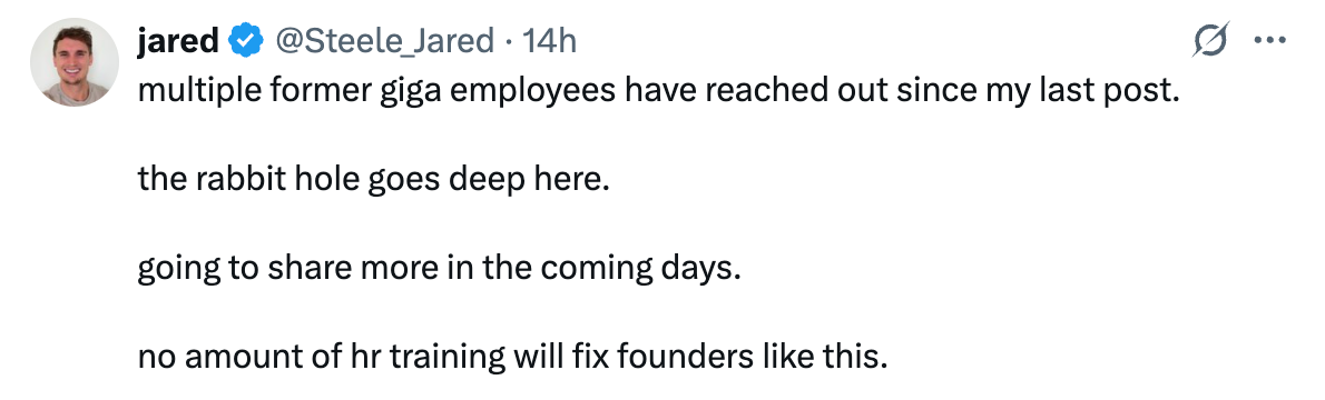 Giga AI, fresh off a $61M raise this week, is facing criticism for its culture and accusations of inflating MRR by 6x, enforcing a 9-9-7 schedule, and more. Yikes.