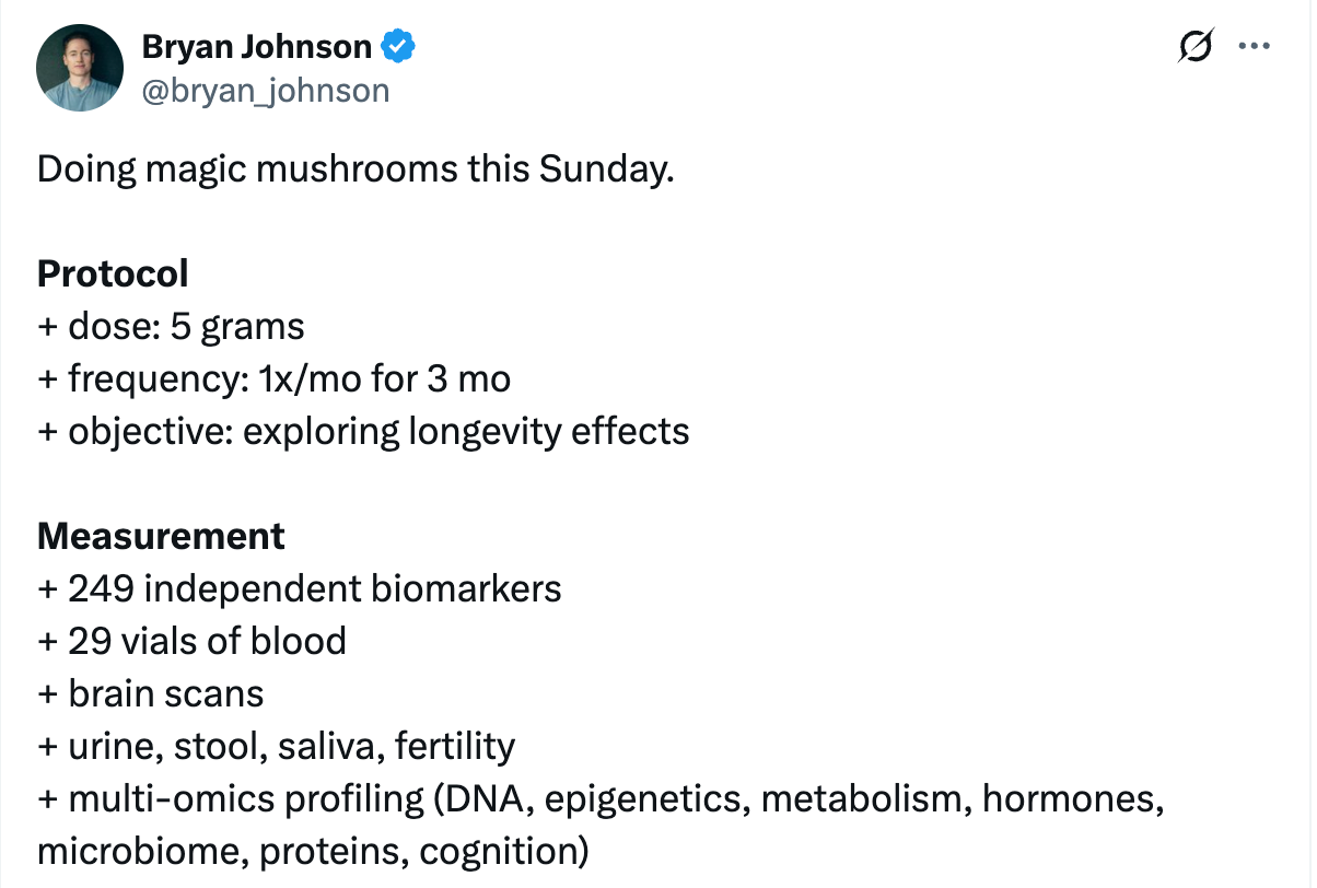 Bryan Johnson is taking 5 grams of mushrooms today to measure dozens of biomarkers as part of his mission to not die. He’s doing it on live stream, wow.
