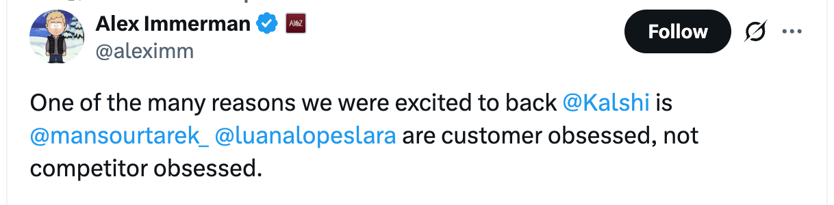 The Kalshi v. Polymarket feud intensified this week. In the past, the Kalshi CEO confirmed that employees asked social media influencers to promote memes about the FBI raid on the Polymarket CEO’s home (see TechCrunch article). Fair-play marketing? Customer-obsessed or competitor-obsessed?